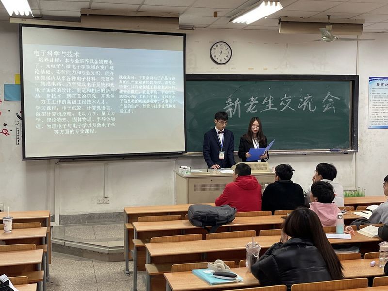 电子信息工程专业邀请郑雨欣学姐和周伟宝学长分享学习经验,为新生答疑解惑。郑雨欣学姐强调了学习自律的重要性,希望大一的萌新们定下目标,并为之努力奋斗!周伟宝学长给新生们分享了自己在高数和C++上的学习方法,对自己科学合理定位的重要性及对待竞赛的态度等宝贵经验。
