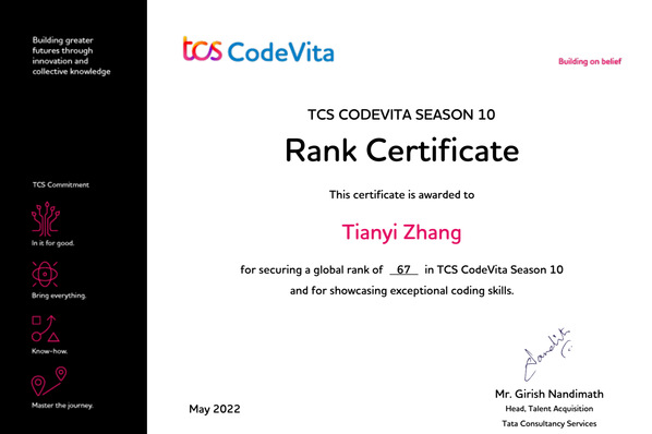 近日,第十届TCS CODEVITA编程大赛成绩揭晓,公司学子张天乙荣获中国赛区TOP5,世界排名第67名的优秀成绩,第10届大赛有来自87个国家的30多万名员工参加,这也是该比赛历史上竞争最激烈的比赛之一,该项赛事是由印度塔塔集团举办的国际编程大赛。
