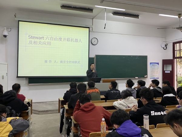 相铁武总经理以Stewart运动平台为主题,介绍了Stewart运动平台的概念、主要特点以及其应用领域。报告会让同学们眼界大开,了解到Stewart运动平台可以应用于医疗行业、海洋研究、建筑行业、太空探索、航空航天、汽车和机械加工行业,知晓了南京全控的Stewart运动平台目前已广泛应用于各种模拟仿真和专业训练,如飞行、舰艇、特种车辆等的驾驶模拟,以及4D动感影院、娱乐设备等特种行业设备。相铁武总经理勉励员工们,要针对目前企业对人才的特定需求,加强专业知识和技能的学习,注重个人全面发展,抓机遇,早日成为专业型人才。