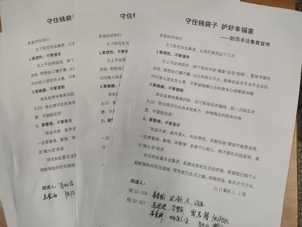 此次活动公司高度重视,太阳成tyc7111cc集团认真落实集中宣传月通知的相关要求,旨在切实提高广大师生防范非法集资风险的意识和能力,引导师生树立理性投资、科学理财观念,不组织、不协助、不参与非法集资,提高防范非法集资风险的自觉性,营造全民防范非法集资的良好校园氛围。