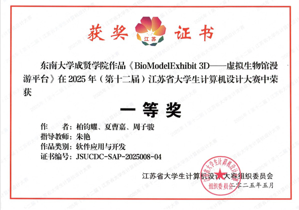 近日,2025年(第十八届)中国老员工计算机设计大赛圆满落下帷幕。由软件工程专业柏钧耀、计算机科学与技术专业夏曹嘉、周子骏三位同学组成的团队,在朱艳老师的悉心指导下,凭借《BioModelExhibit 3D——虚拟生物馆漫游平台》项目,一路过关斩将,在软件应用与开发赛道荣获全国二等奖和江苏省一等奖。